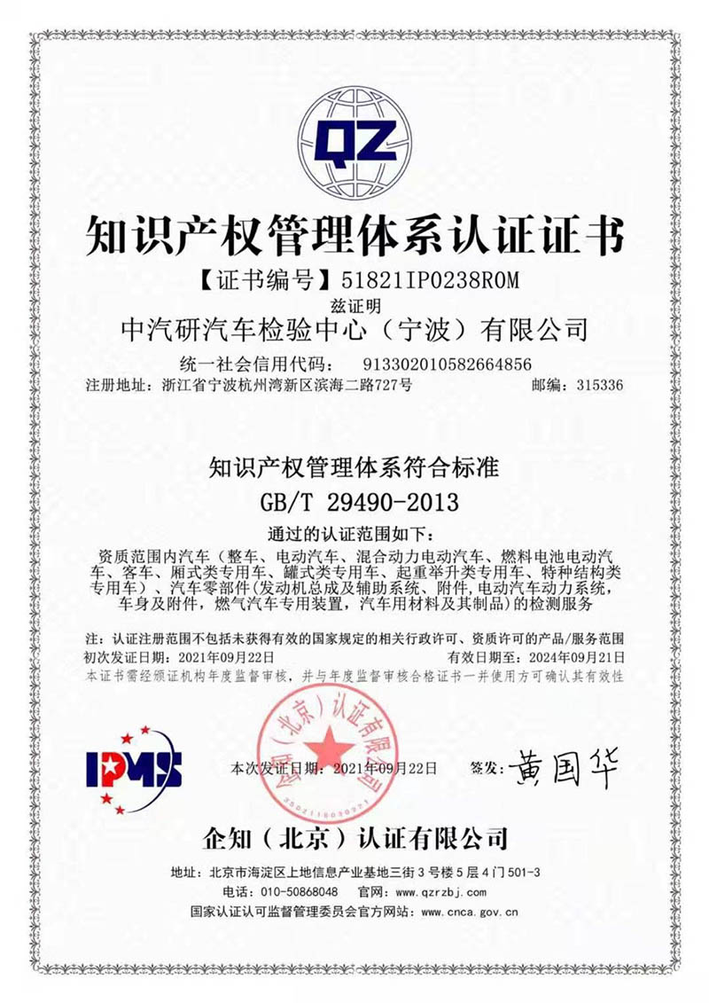 2021年9月22日,寧波檢驗中心下屬中汽研汽車檢驗中心(寧波)有限公司、中汽研汽車零部件檢驗中心(寧波)有限公司順利通過知識產權管理體系認證。