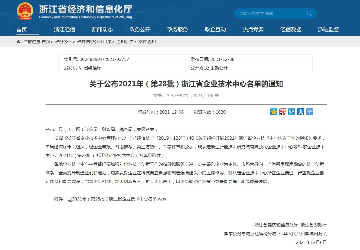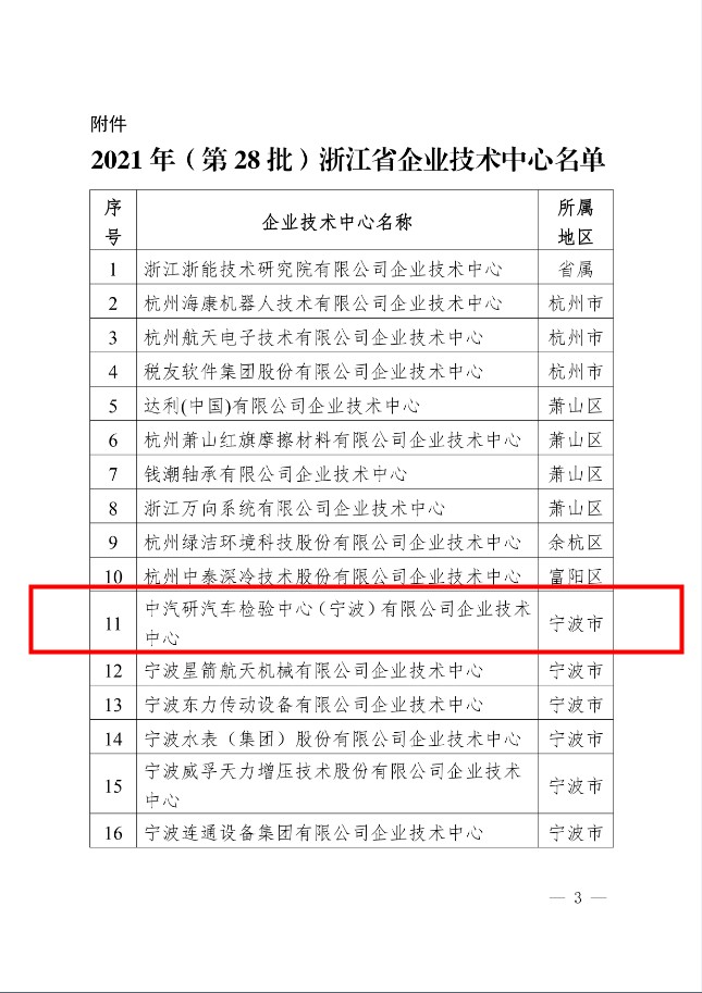 12月10日,浙江省經(jīng)濟(jì)和信息化廳公布了2021年(第28批)省級(jí)企業(yè)技術(shù)中心名單,中汽研汽車檢驗(yàn)中心(寧波)有限公司企業(yè)技術(shù)中心被認(rèn)定為浙江省企業(yè)技術(shù)中心。